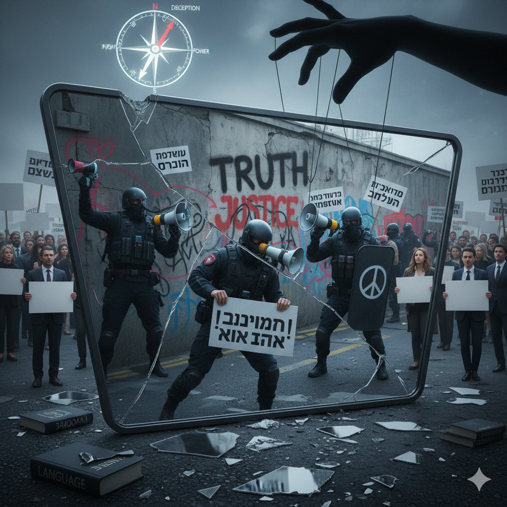 כאשר ארגוני מחאה מייחסים את מעשיהם ליריביהם הם מייצרים 'מראה הפוכה': הם משתמשים בדיוק בכלים שמיוחסים לאויב, אבל למען מטרה נעלה, בשם ה'אמת' וה'צדק'. כך, חדלה השפה להיות אמצעי תיאור, והופכת לנשק פוליטי, ומי שמנצח, הוא המחנה שמוכן ללכת רחוק יותר בהרס מושג האמת... סוג של לוחמה תודעתית במסווה אזרחי.