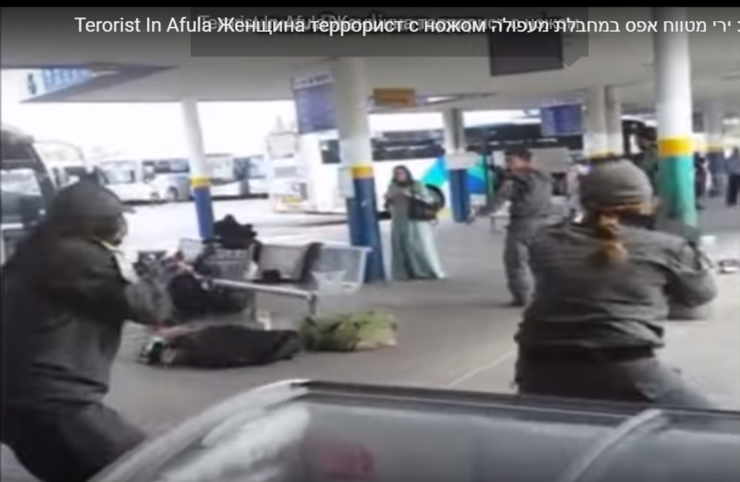 הצעירה עומדת במקומה עם הסכין בידה, כשאינה מנסה לתקוף. בסרטון נשמעות צעקות לעברה להשליך את הסכין מידיה. אחרי דקות ארוכות מגיע למקום בריצה שוטר, ויורה בה מיד בפלג גופה התחתון. הצעירה שנורתה, בשנות השלושים לחייה, בעלת תואר שני, עובדת במוסד רפואי ידוע ועוסקת בו בתחום המחקר" (סבתי, 2015).