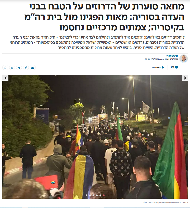 ב- 1 במאי 2025 יצאו שוב הדרוזים לרחובות על רקע הטבח שנעשה בבני עמם בסוריה, ותחושתם שבנימין נתניהו הפר הבטחה פומבית להגן עליהם. עשרות מנכבדי העדה ומאות מפגינים נוספים הגיעו הלילה למחות מול בית רה"מ בנימין נתניהו בקיסריה. הובערו מדורות ונשרפו צמיגים, נחסמו כבישים ונוצרו פקקי ענק נראו. לוחמים דרוזים במילואים התארגנו והצהירו על נכונות ללבוש מדים ולצאת להצלת אחיהם (ראו הכתבה למטה).