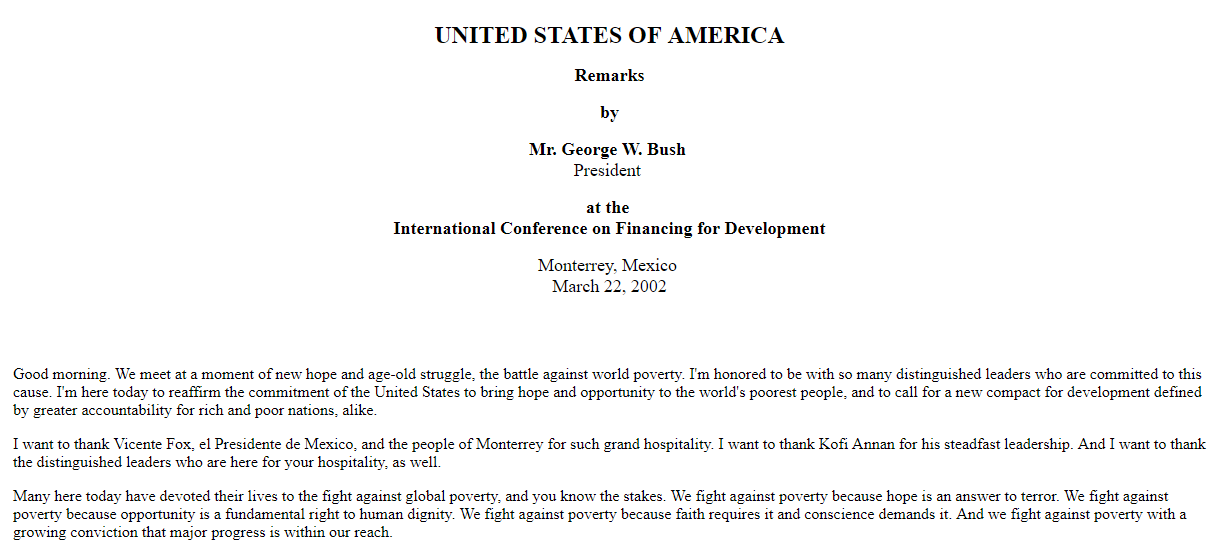 ב-22 במרץ 2002, נאם נשיא ארצות הברית לשעבר, ג'ורג' וו בוש, בכנס הבינלאומי למימון הפיתוח (International Conference on Financing for Development), שהתקיים במונטריי, מקסיקו (Monterrey, Mexico), בנוכחות מנהיגים נוספים, כנשיא מקסיקו דאז, וינסנט פוקס (Vicente Fox) ומזכ"ל האו"ם דאז, קופי אנאן (Kofi Annan). הוא אמר שם דברים מפורשים בהקשר זה: "אנחנו נלחמים בעוני כי תקווה היא התשובה לטרור" (We fight against poverty because hope is an answer to terror).