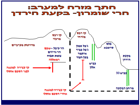 - הרכסים ממערב למישור הבקעה מעבר לרצועה הצרה הנמתחת בין אפיק הירדן לאורך כביש 90 לבין תחילת המעלה ההררי. כוח צבאי שלא יאחז גם בקווי המצוקים והגבעות השולטים על הבקעה ממערב לציר 90 ימצא עצמו חשוף לסיכונים משמעותיים.[ix]