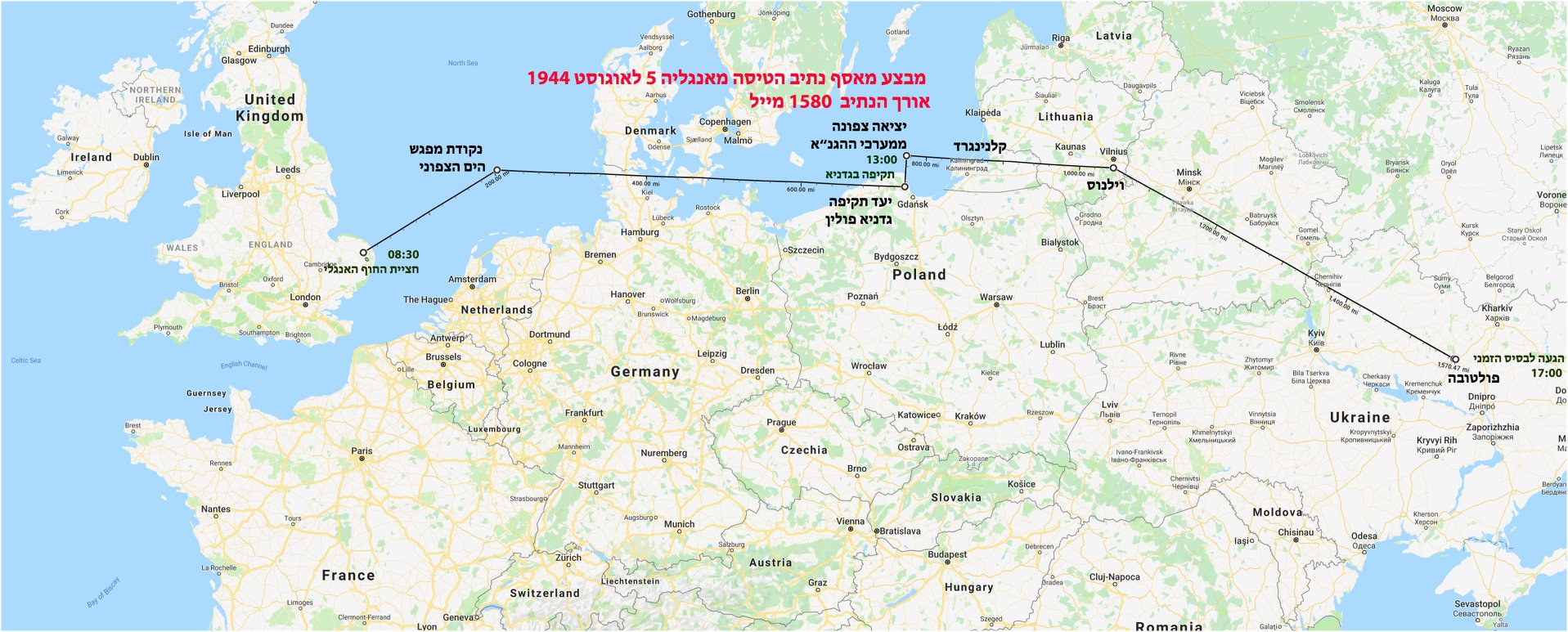 [בתמונה: נתיב הטיסה בין אנגליה לפולטובה]