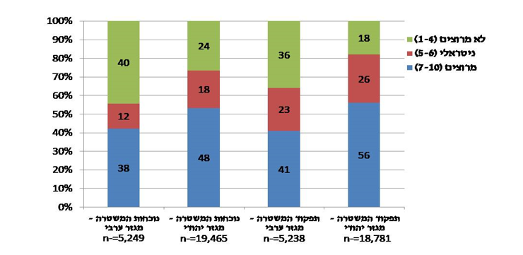 במגזר הערבי, כ- 40% מהנשאלים אינם מרוצים מהיקף הנוכחות המשטרתית בסביבת מגוריו לעומת 24% שאינם מרוצים מקרב היהודים[1]. תמונה דומה רואים ביחס לאיכות התפקוד של המשטרה בסביבת המגורים, בעוד שבמגזר הערבי, 36% אינם מרוצים מתפקודה, במגזר היהודי עומד שיעורם על 18%.