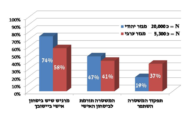 - היקף האלימות בחברה הערבית – 54% מהציבור הערבי חש כי ביישובו קיימת בעיה של אלימות, לעומת 14% בקרב היהודים.