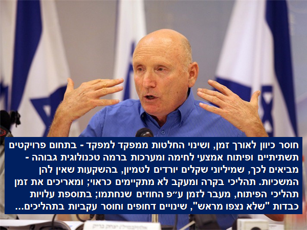 רצף פיתוח וקליטת אמצעים - שעלו מליארדי שקלים - נגדע עם החלפת מפקדים, שממציאים את הגלגל מחדש, משנים כיוון ופוגעים אנושות ברצף תכניות הפיתוח ובישומן. מליארדי שקלים יורדים לטמיון עם פרויקטים, שזמן הפיתוח שלהם הוכפל כתוצאה מחוסר בקרה ומעקב של הצבא על החברות האזרחיות המפתחות. כתוצאה, מכך גם עלות הפיתוח מוכפלת, וכאשר באים למימוש, מסתבר שחלק מהפרויקטים כבר לא רלוונטים; והם נסגרים 'מתחת לרדאר' ללא בירור; וללא הפקת לקחים. אף אחד לא נותן את הדין, אין דין ואין דיין; אין הפקת לקחים ויישומם, והעולם כמנהגו נוהג וממשיך כאילו דבר לא קרה.