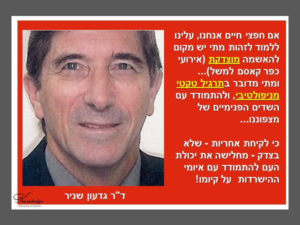 אם חפצי חיים אנחנו, עלינו ללמוד לזהות מתי יש מקום להאשמה מוצדקת (אירועי כפר קאסם למשל) ומתי מדובר בתרגיל טקטי מניפולטיבי, ולהתמודד עם השדים הפנימיים של מצפוננו, כי לקיחת אחריות - שלא בצדק - מחלישה את יכולת העם להתמודד עם איומי ההישרדות על קיומו!