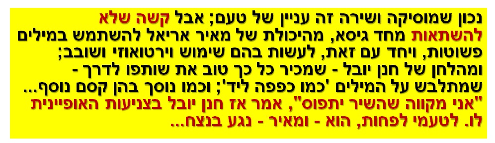 אז נכון שמוסיקה ושירה זה עניין של טעם; אבל קשה שלא להשתאות מחד גיסא, מהיכולת של מאיר אריאל להשתמש במילים פשוטות, ויחד עם זאת, לעשות בהם שימוש וירטואוזי ושובב; ומהלחן של חנן יובל - שמכיר כל כך טוב את שותפו לדרך - שמתלבש על המילים 'כמו כפפה ליד'; וכמו נוסך בהן קסם נוסף...