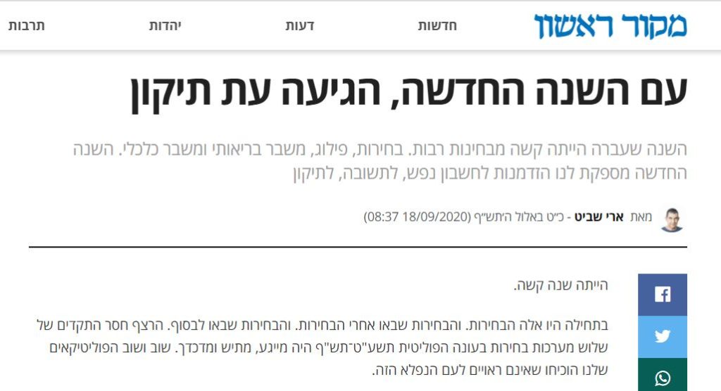 ב- 18 בספטמבר פרסם הפובליציסט, ארי שביט בעיתון 'מקור ראשון' מאמר מרתק, תחת השם: "עם השנה החדשה, הגיעה עת תיקון". במאמר טוען שביט כי "השנה שעברה הייתה קשה מבחינות רבות. בחירות, פילוג, משבר בריאותי ומשבר כלכלי. השנה החדשה מספקת לנו הזדמנות לחשבון נפש, לתשובה, לתיקון".