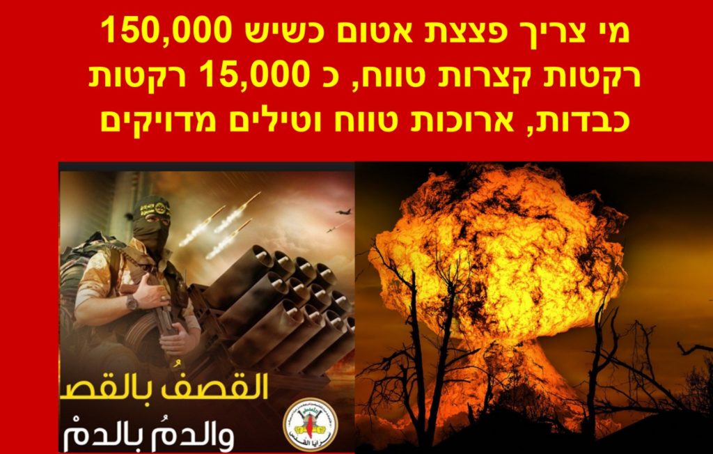[בתמונה: צפוי שההרג והנזק - שיגרמו עשרות אלפי הרקטות והטילים שינחתו כאן - יהיו בממדים תנ"כיים... יוצר הכרזה: ד"ר אלי מירון. התמונה הימין היא נחלת הכלל. התמונה השמאלית היא צילום מסך מהטלוויזיה האיראנית]