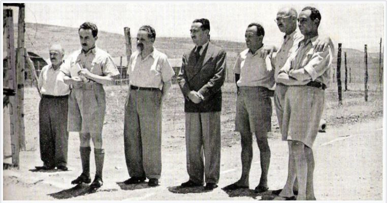 [בתמונה: שבעה ממנהיגי היישוב העצורים במחנה המעצר בלטרון, לאחר השבת השחורה. שם הצלם אינו ידוע. התמונה היא נחלת הכלל][בתמונה: שבעה ממנהיגי היישוב העצורים במחנה המעצר בלטרון, לאחר השבת השחורה. שם הצלם אינו ידוע. התמונה היא נחלת הכלל]