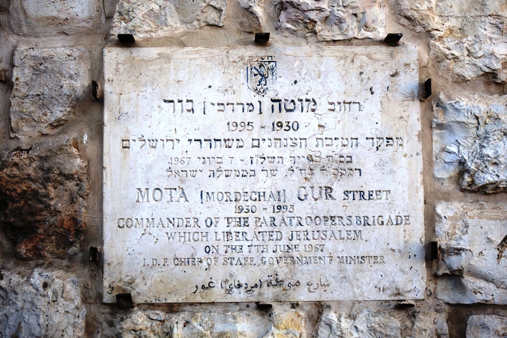 [בתמונה: לוח אבן לזכרו של מוטה גור המציין כי הרחוב היוצא משער האריות קרוי על שמו. התמונה נוצרה ואושרה לשימוש ע"י מיכאלי][בתמונה: לוח אבן לזכרו של מוטה גור המציין כי הרחוב היוצא משער האריות קרוי על שמו. התמונה נוצרה ואושרה לשימוש ע"י מיכאלי]