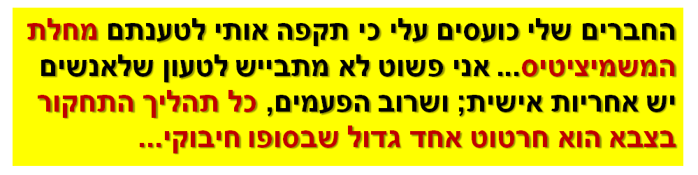 החברים שלי כועסים עלי כי תקפה אותי לטענתם מחלת המשמיציטיס. אני פשוט לא מתבייש לטעון שלאנשים יש אחריות אישית; ושרוב הפעמים, כל תהליך התחקור בצבא הוא חירטוט אחד גדול שבסופו חיבוקי...