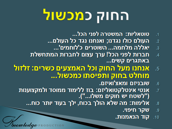 ![[אחד מסעיפי קוד ההתנהגות של תרבות השוטרים הוא הנכונות לעבור על החוק למען השגת המטרה, והבוז המוחלט לחוק - שאותו המשטרה אוכפת, ואמורה לתת דוגמה אישית, בשמירה עליו... הכרזה: ייצור ידע]](https://www.xn--7dbl2a.com/wp-content/uploads/2021/09/החוק-כמכשול-1.png)