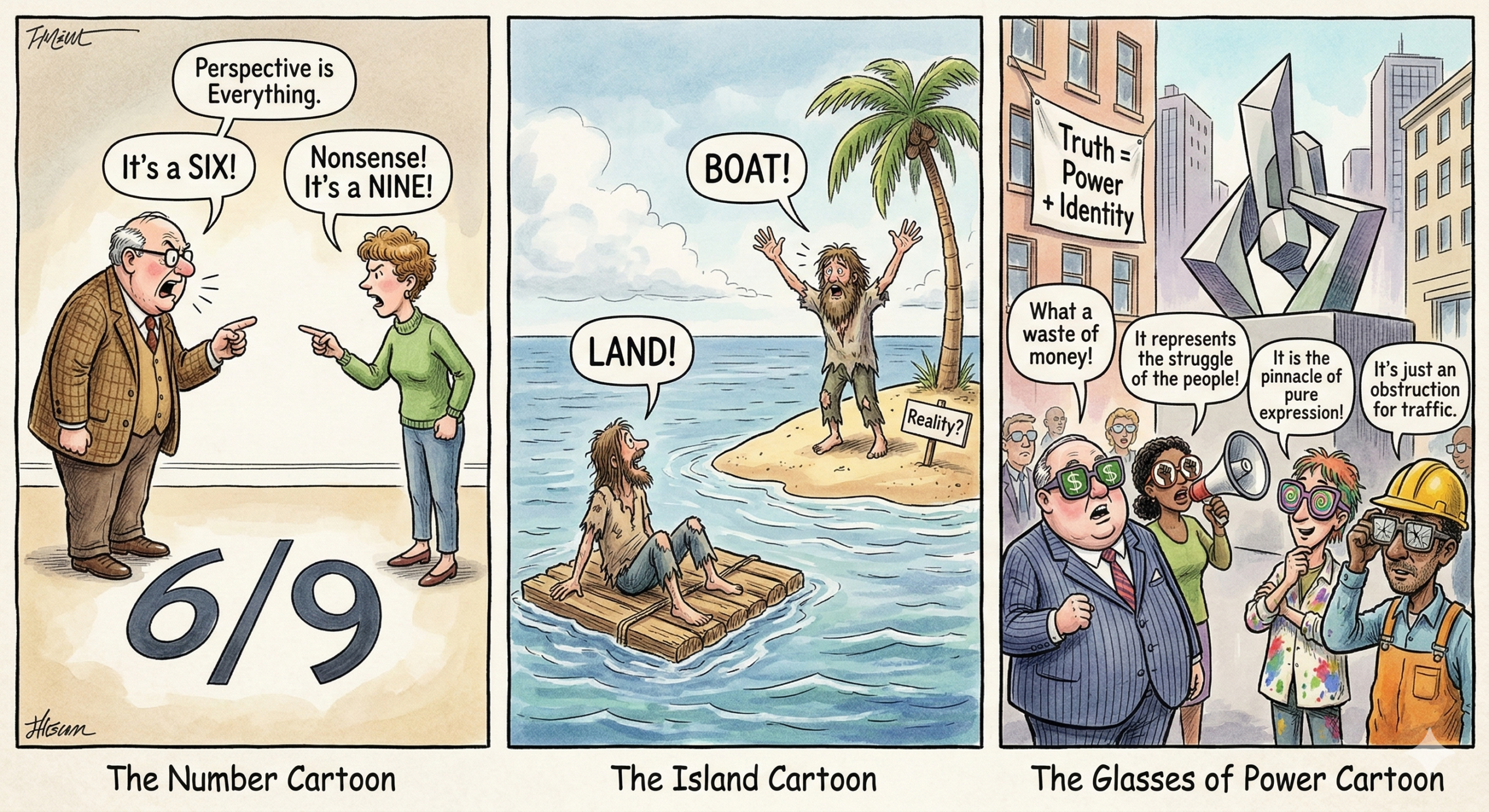 הציור משמאל - קריקטורת המספר (הקלאסית): זוהי הדרך הפשוטה והחזקה ביותר להמחיש רלטיביזם אפיסטמולוגי (הקשור לידע). שני אנשים עומדים משני צדי המספר 6 (או 9) שכתוב על הרצפה. האחד מצביע בביטחון וצועק: "זה שש!", והשני עונה בכעס: "מה פתאום? זה תשע!". האמת תלויה כמובן אך ורק במיקום הפיזי ובזווית הראייה של הצופה. שניהם צודקים בתוך עולמם, אך אין "אמת אובייקטיבית" שמרחפת מעליהם.