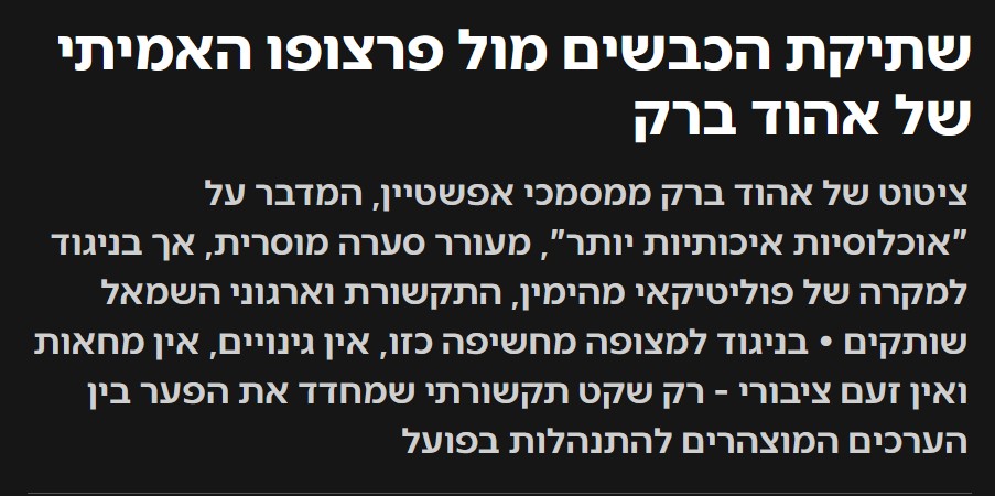 "החשיפה האחרונה מתוך מסמכי אפשטיין, המביאה ציטוט של אהוד ברק מ-2013, היא לא פחות מרעידת אדמה מוסרית. ברק נשמע שם מדבר על הצורך להביא "אוכלוסיות איכותיות יותר". המשתמע מכך מצמרר אך ברור: האוכלוסייה הנוכחית, ובפרט זו שהגיעה בעליות מארצות צפון אפריקה והמזרח, היא בעיניו "סחורה פגומה". או בלשונו של ברק – "בררה"...