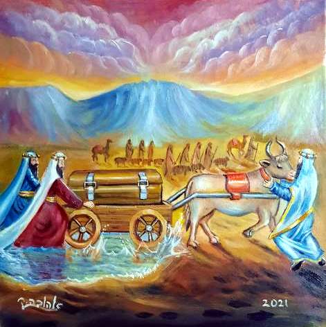 [התמונה: ציורי תנ"ך / " וַיִּקַּח מֹשֶׁה אֶת-עַצְמוֹת יוֹסֵף, עִמּוֹ:  כִּי הַשְׁבֵּעַ הִשְׁבִּיעַ אֶת-בְּנֵי יִשְׂרָאֵל, לֵאמֹר, פָּקֹד יִפְקֹד אֱלֹהִים אֶתְכֶם, וְהַעֲלִיתֶם אֶת-עַצְמֹתַי מִזֶּה אִתְּכֶם". / ציירה: אהובה קליין (c), שמן על בד]