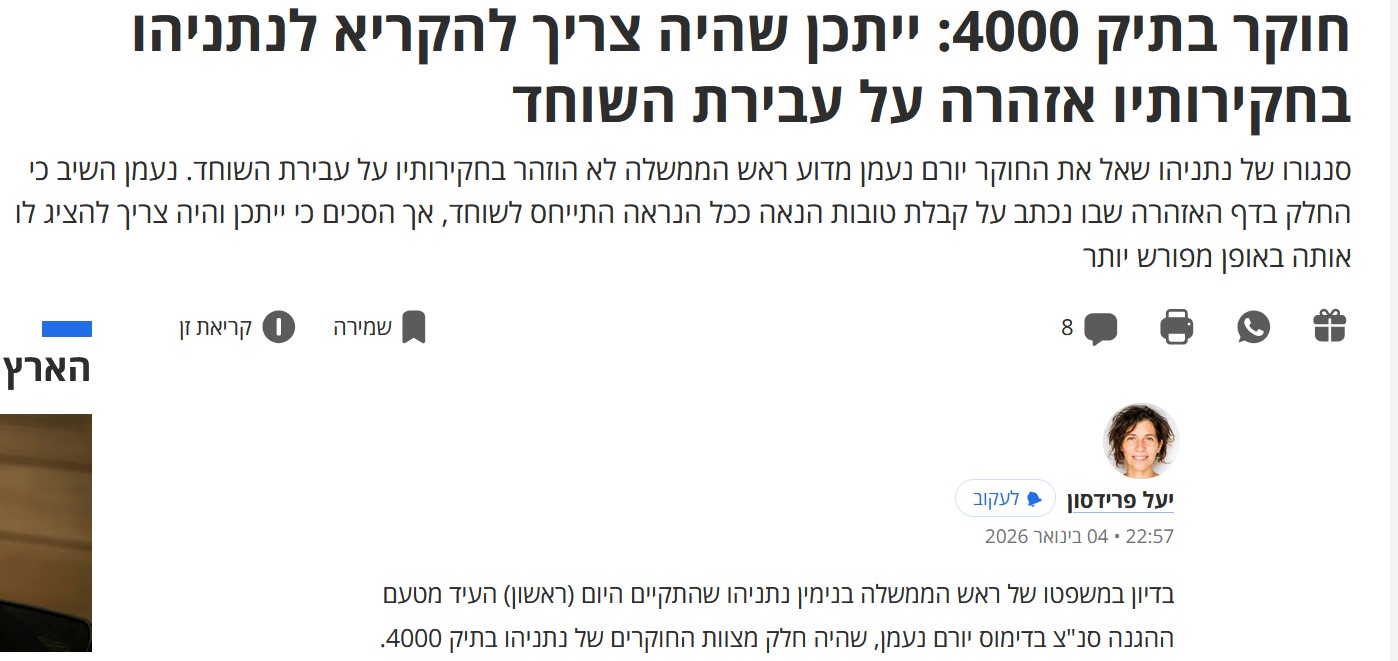 יעל פרידסון ב'הארץ': חוקר בתיק 4000: ייתכן שהיה צריך להקריא לנתניהו בחקירותיו אזהרה על עבירת השוחד