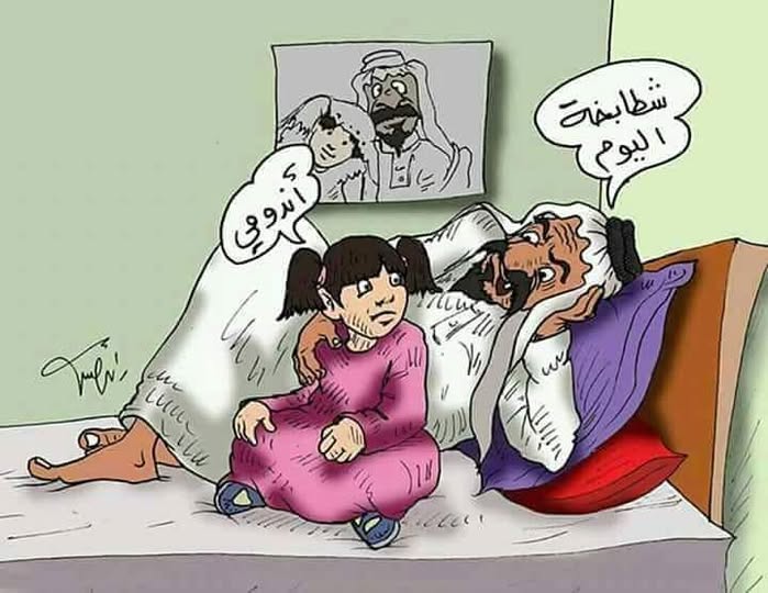 קריקטורה עיראקית תחת הכותרת: "לא לנישואי קטינות!", שבה אדם זקן, שנראה תשוש (מעניין למה...), מחבק במיטה את אשתו הילדה (מעליהם תלויה תמונת נישואיהם) ושואל אותה: "מה בישלת היום?" ("שְׁטַאבִּיחָ'ת אִלְיוֹם") והיא משיבה "אִנְדוּמִי" שזה מותג פופולרי של איטריות אינסטנט, תשובה המשקפת את משקפת את חוסר הבגרות שלה ואת הפער בינה לבין הצרכים והשיחות של בן זוג מבוגר..