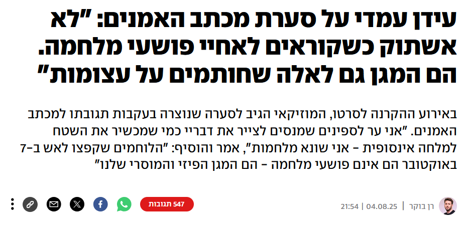 בתגובת הזמר עידן עמדי לעצומת האמנים מצוי מפתח להתבוננות הנדרשת. הוא כינה אותם "חבורת מנותקים" - הם אכן מנותקים גם מההקשר הכולל, גם מההקשר הנסיבתי הפרטני של המלחמה בחמאס, אותו זכה עמדי להכיר כלוחם. כמו כל שאלה אנושית מורכבת גם כאן מדובר בתופעה מורכבת, שאינה יכולה להתברר בבתי מדרש או אולפנים, בדיון אידאלי נטול הקשר.