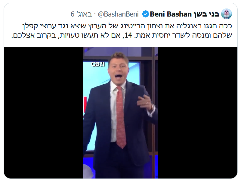 תקשורת, שמשמשת שופר לחמאס, ומחבלת במודע בסיכויים להחזיר את החטופים. אנחנו בדרך לנצח בתחום התודעה. אנחנו בדרך לניצחון של החופש והערכים שלנו, על פני קבוצה של תבוסתנים עלובים ומהנדסי תודעה. קישור לסרטון שבו GBN חוגגת את ההישג המדהים ואת שינוי התודעה העמוק בבריטניה — בתגובה הראשונה. וכדאי גם שמישהו בערוצי התבוסתנות ישמע את דבריו של רם לנדס, אדם חכם, ומי שהיה בעבר העורך של חדשות 10, על הטעות החמורה של הערוצים האלה כיום. הם צוללים לתהומות מוסריים ותודעתיים.