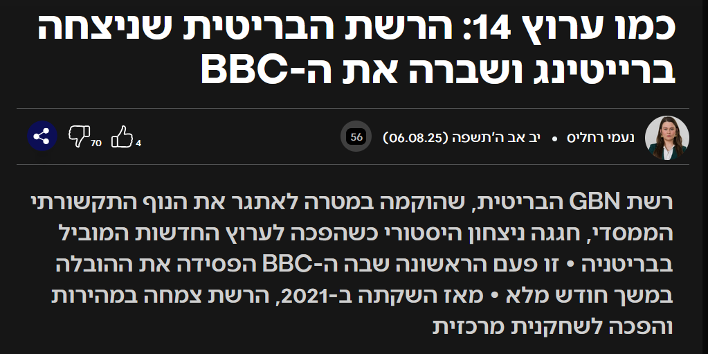 ב- 5 באוגוסט 2025 חגגה רשת GBN הבריטית - רשת שמזוהה עם הקו של נייג'ל פרג', המועמד המוביל לראשות ממשלת בריטניה כנציג העם וכמתנגד ל״ווק״ - את הפעם הראשונה שבה גברה על ה-BBC, וסקיי ניוז הרחק במקום השלישי. GBN ידועה בתמיכתה הברורה בישראל. פוקס ניוז כבר מזמן מחצה עד היסוד את CNN, NBC ו-ABC. ל-CNN יש רייטינג עלוב. הטאלנטים ברשתות האלה מפוטרים אחד אחרי השני.