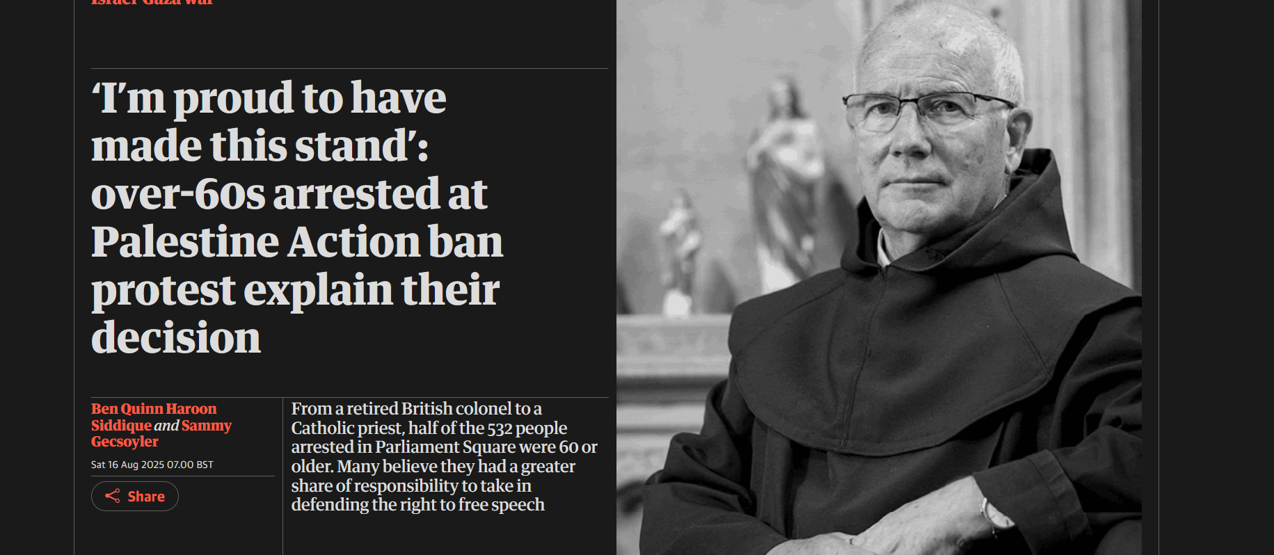 גרדיאן: ‘I’m proud to have made this stand’: over-60s arrested at Palestine Action ban protest explain their decision