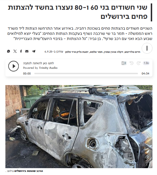 השניים חשודים בהצתות פחים בשכונת רחביה. באירוע אחר התרחשו הצתות ליד משרד ראש הממשלה • תמר בר שי שרכבה נשרף בעקבות הצתות הפחים: "בעלי יוצא למילואים שבוע הבא ואני עם רכב שרוף". בן גביר: "גל ההצתות - בגיבוי היועמ"שית העבריינית"