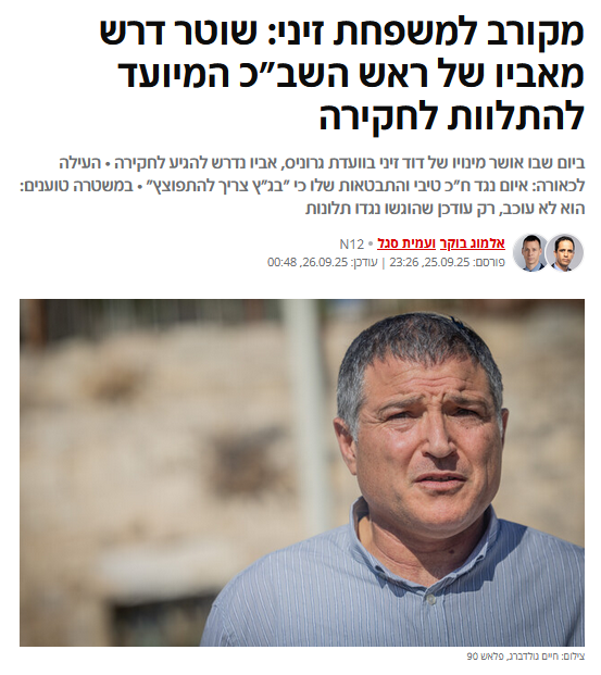 ב- 24 בספטמבר 2025 - שעה וחצי לפני שוועדת גרוניס אישרה, פה אחד, את מועמדותו של דוד זיני לראש השב"כ - הגיע שוטר ממשטרת אשדוד לביתו של אביו של זיני, ודרש מאביו להתלוות אליו לחקירה. האב סירב.