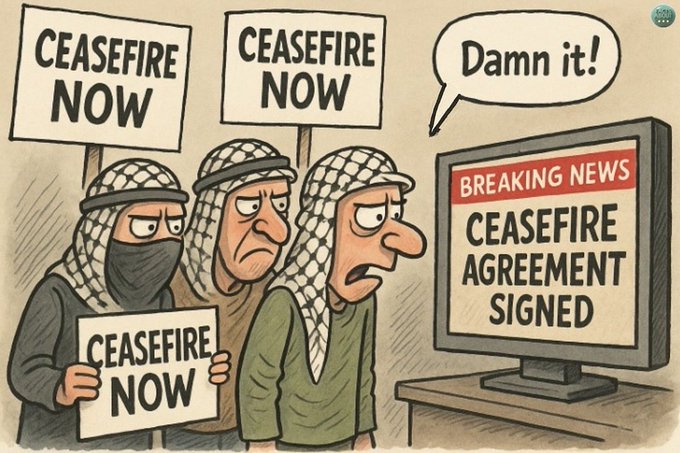 [בתמונה: אוי, נחתם הסכם הפסקת האש. ומה נעשה עתה? המקור: דף הטוויטר של facts about. אנו מאמינים כי אנו עושים בתמונה שימוש הוגן]