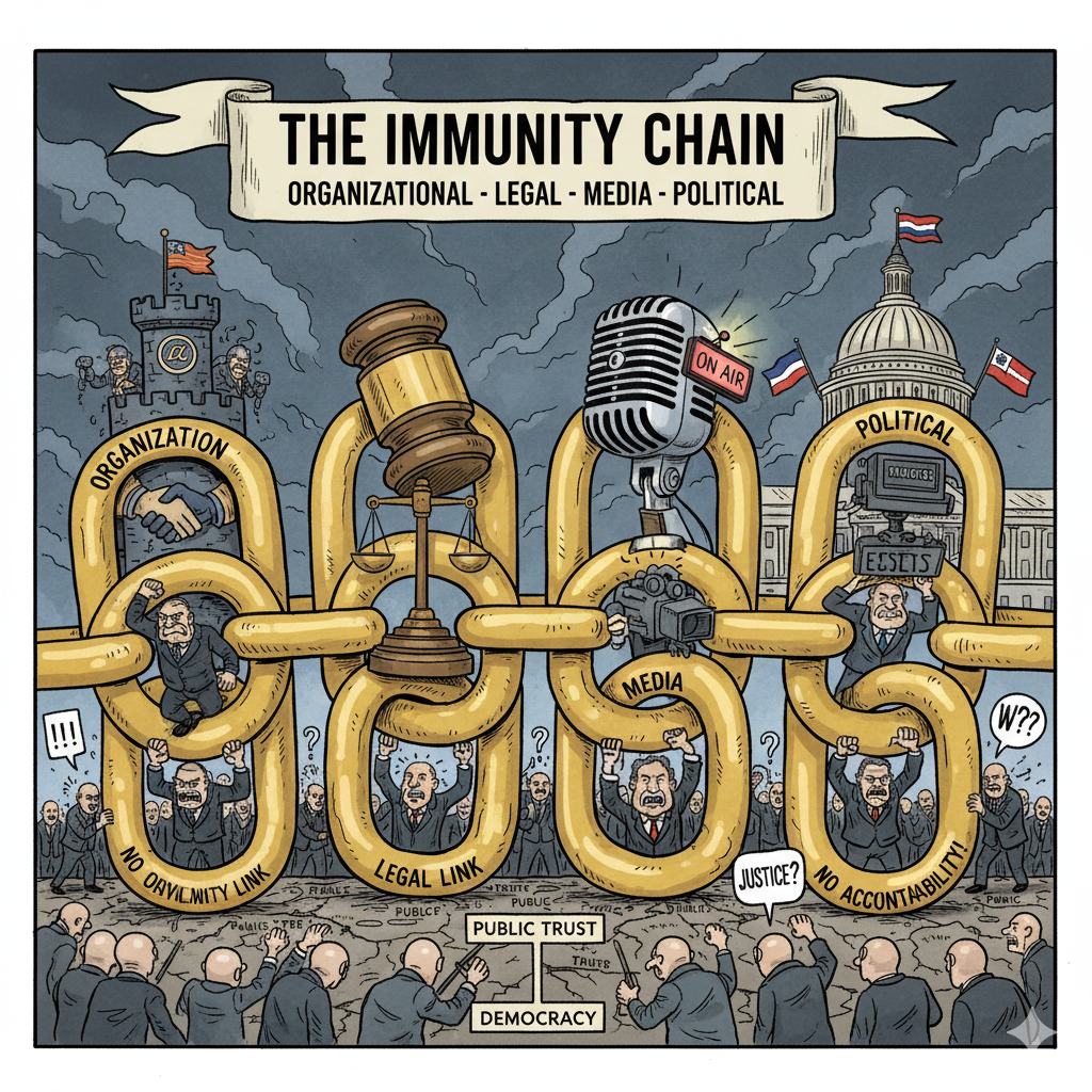 “שרשרת חסינות” היא מנגנון של חיפוי הדדי בין בעלי כוח במערכת סגורה, הפועל לשימור יציבות המוסד גם במחיר פגיעה בעקרון השקיפות (Douglas, 1986). מדובר בתופעה קולקטיבית, שהיא בדרך כלל לא קונספירטיבית: לרוב, אין “חבורה מתואמת”, אלא קוד ארגוני המושתת על הנחה סמויה: “אנו שומרים על אנשינו”.