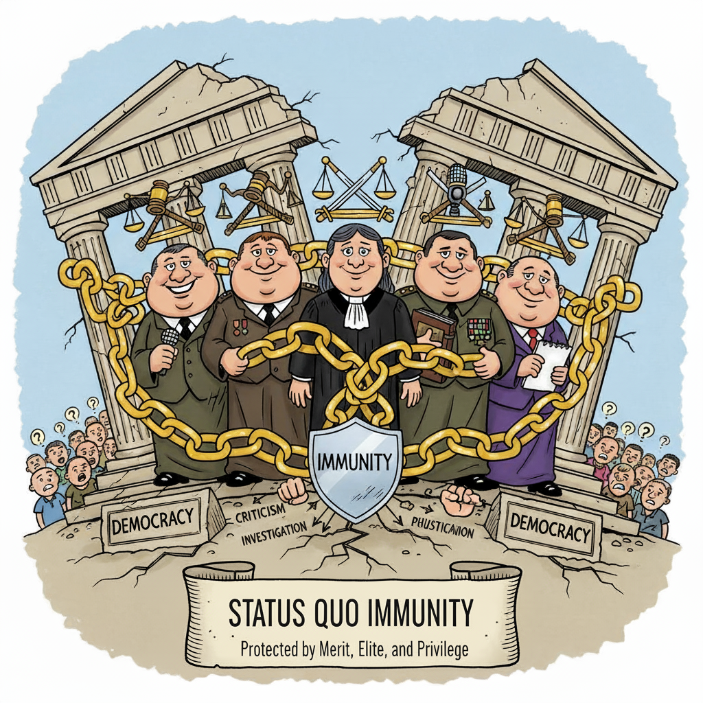 - החוליה התקשורתית – שליטה בנרטיב: מערכת המשפט בישראל נהנית מתדמית של “שומרת סף” מוסרית. המלובה ע"י תקשורת הליבה. כך נוצרת חסינות חיצונית: הציבור מקבל בעיקר את המסרים שמעצימים את תדמית המערכת (Shinar, 2016).