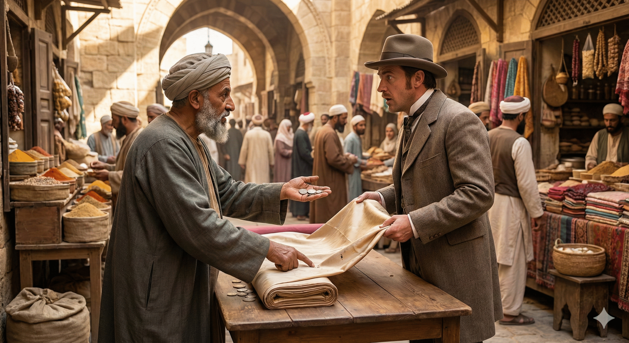 דמיינו לרגע שוק סואן במזרח התיכון של המאה ה-19. רעש, צפיפות, ריחות של תבלינים וצעקות של סוחרים שמנסים למכור את מרכולתם. בתוך ההמון הזה, עומד סוחר בדים מוסלמי.