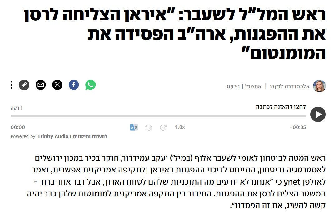ראש המטה לביטחון לאומי לשעבר אלוף (במיל') יעקב עמידרור, חוקר בכיר במכון ירושלים לאסטרטגיה וביטחון, התייחס לדיכוי ההפגנות באיראן ולתקיפה אמריקנית אפשרית, ואמר לאולפן ynet כי "אנחנו לא יודעים מה התוכניות שלהם לטווח הארוך, אבל דבר אחד ברור - המשטר הצליח לרסן את ההפגנות. החיבור בין התקפה אמריקנית למומנטום שלהן כבר יהיה קשה להשיג, את זה הפסדנו".