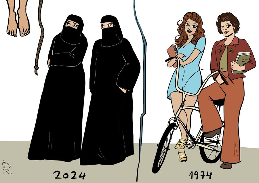 [בתמונה: נשות איראן אז והיום... המקור: דף הטוויטר של עידית בר. היוצר: TICP (The Israeli Cartoon Project). אנו מאמינים כי אנו עושים בתמונה שימוש הוגן]