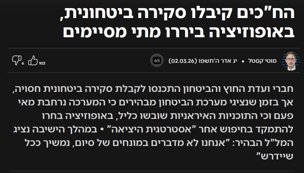ב- 2 במרץ 2026, התכנסו חברי ועדת החוץ והביטחון לקבלת סקירה ביטחונית חסויה על המלחמה, והאופוזיציה התמקדה במה? בניצחון? בדרכים להשגתו? ממש לא. היא התמקדה ב"אסטרטגית היציאה" מהמלחמה כמובן. ברוכים הבאים לעולם הטירלול הווקיסטי.