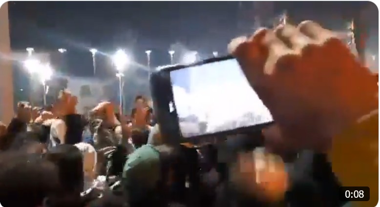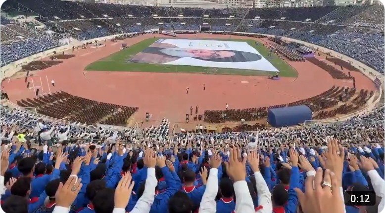 [בתמונה: אצטדיון שלם של צעירי חיזבאללה מצדיעים בהצדעה נאצית לזכר גיבורם נסראללה... התמונה היא צילום מסך]