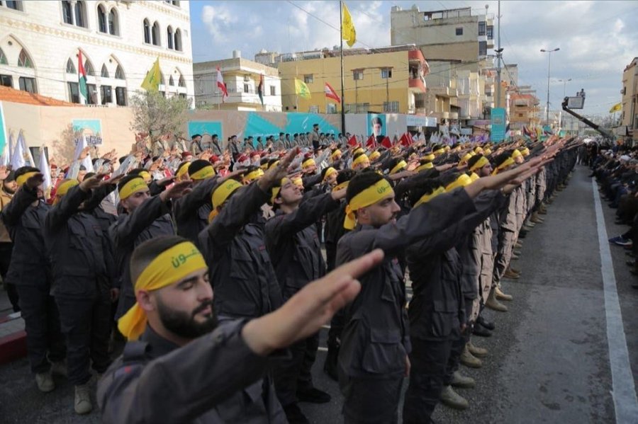 [בתמונה: לוחמי חיזבאללה מצדיעים במועל יד נאצי... המקור: דף הטוויטר של Sam van Rooy MP. אנו מאמינים כי אנו עושים בתמונה שימוש הוגן]