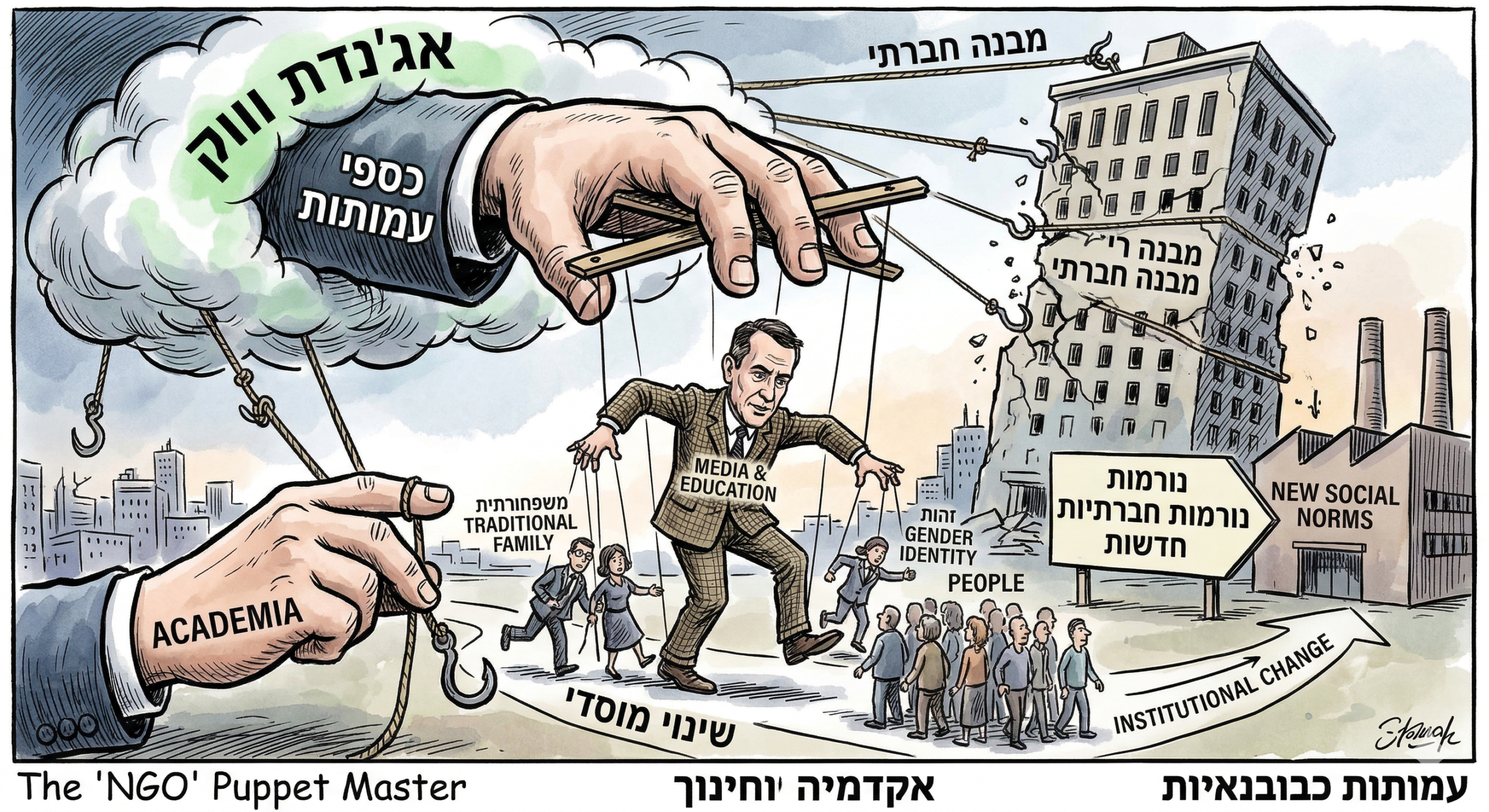 באמצעות רשת מסועפת של מימון גלובלי, ארגונים אלו אינם מסתפקים עוד בתיקון עוולות נקודתי. הם מחדירים 'וירוס אינטלקטואלי' לתוך המערכת הממסדית, ומעתיקים את מרכז הכובד הדמוקרטי, מהפרלמנט הנבחר אל מסדרונות המשפט והפקידות, תוך שימוש במונחים של "צדק חלוקתי" ו"רגישות תרבותית". כך, הם מערערים את הלגיטימיות של המדינה הלאומית ואת ערכי המערב. זהו תהליך של חתרנות ממוסדת, שבו העמותה משמשת כ'סוס טרויאני' מוסרי; היא נכנסת בשערי הארגונים הגדולים בשם ההכלה והשוויון, אך בפועל מבצעת הנדסת תודעה ושפה המפרקת את הלכידות החברתית ומחליפה את המריטוקרטיה בסטטיסטיקה של זהויות, ובכך הופכת את הסדר הקיים למבנה רעוע המוחזק כבן ערובה בידי אליטה בירוקרטית שלא נבחרה מעולם.
