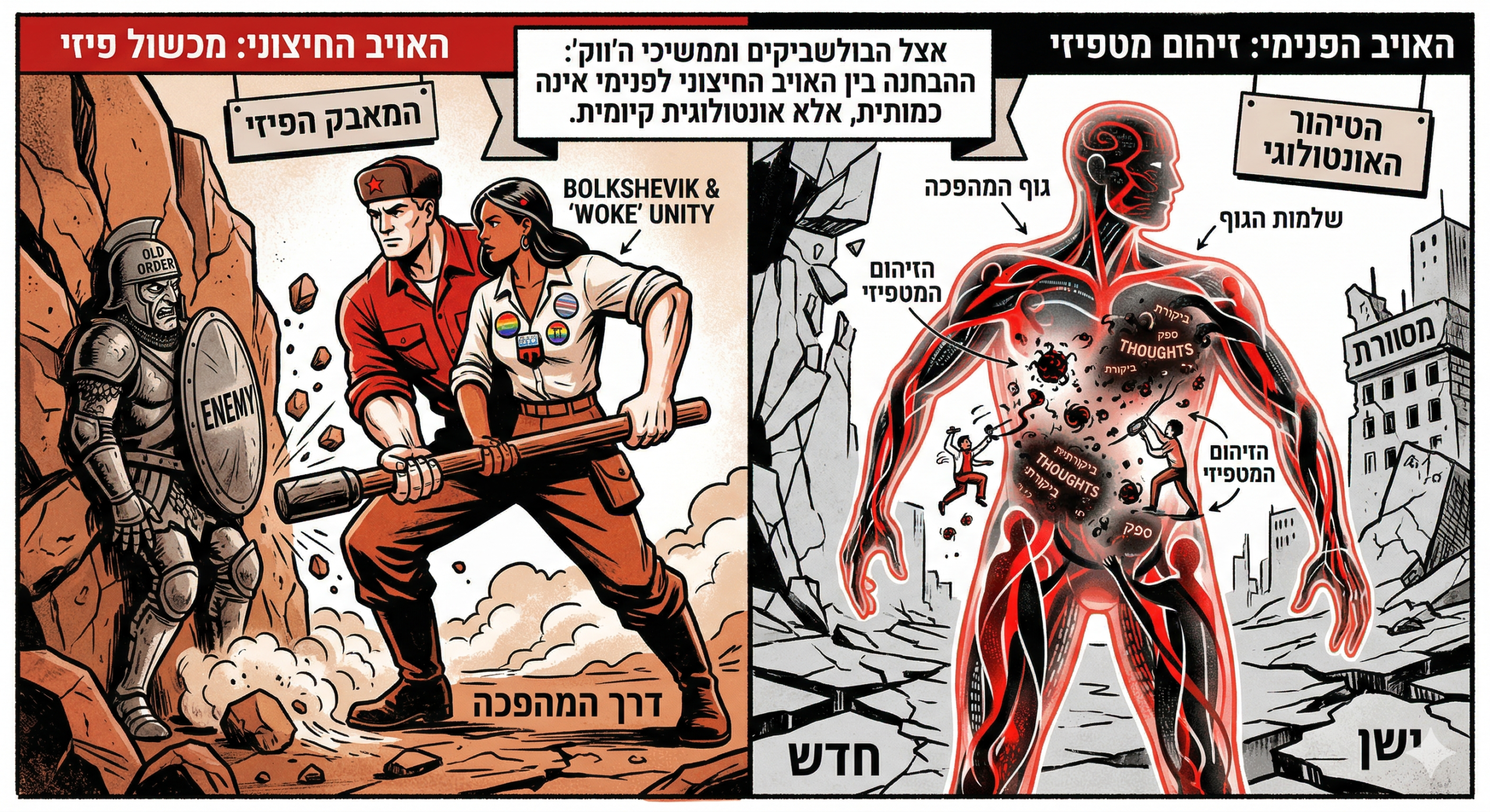 ![[בתמונה: אצל הבולשביקים וממשיכי דרכם בתנועת ה'ווק', ההבחנה בין האויב החיצוני לפנימי אינה כמותית, אלא אונטולוגית קיומית: בעוד האויב החיצוני הוא מכשול פיזי שיש להכניעו, האויב הפנימי נתפס כזיהום מטפיזי המאיים על שלמות ה"גוף" המהפכני התמונה עובדה במערכת הבינה המלאכותית Gemini' של גוגל]](https://www.xn--7dbl2a.com/wp-content/uploads/2026/03/האויב-מבית-1024x559.png)