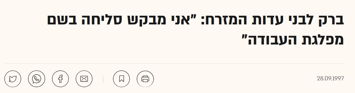 ב- 27 בספטמבר 1997, ביקש יו"ר מפלגת העבודה דאז, ח"כ אהוד ברק,סליחה מבני עדות המזרח, המתגוררים בעיירות הפיתוח, בגלל עגמת הנפש הרבה שנגרמה להם בשנותיה הראשונות של המדינה ע"י תנועת העבודה. "אני מבקש סליחה בשם מפלגת העבודה ומפא"י על כל דורותיה", ציין ברק בהודעתו.