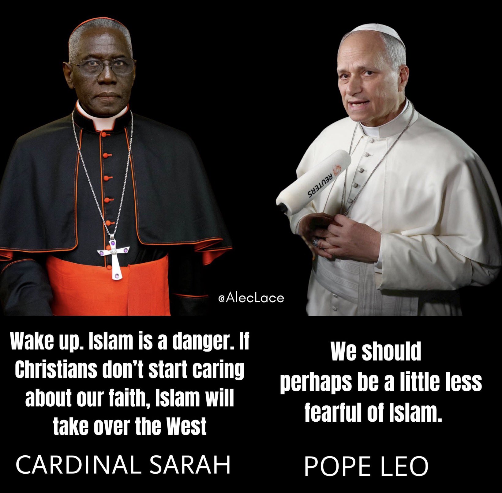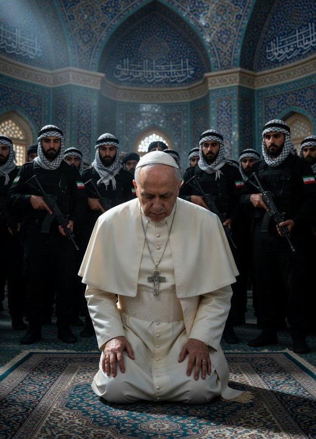 במקום לעמוד כחומה בצורה מול שקיעת הנצרות והמרת הדת ההמונית של מאמיניה – שנוטשים את כנסיותיהם – האפיפיור ליאו בוחר בנתיב של התרפסות והתמסרות לאיסלאם, ומטיף לאיחוד רוחני בלתי אפשרי בינו לבין הנצרות (אתם לבטח מתארים לעצמכם, איך יראה 'איחוד' כזה…). הוא מספר למאמיניו שהאיסלאם הוא "דת של שלום", שעליהם לחשוש ממנה פחות, ומטיף להושיט ידיהם למהגרים. בסיורו באלג'יריה, במסגד "ג'אמה אל-ג'זאיר" (המסגד השלישי בגודלו בעולם), הוא כינה אותו: "מרחב קדוש לאל".