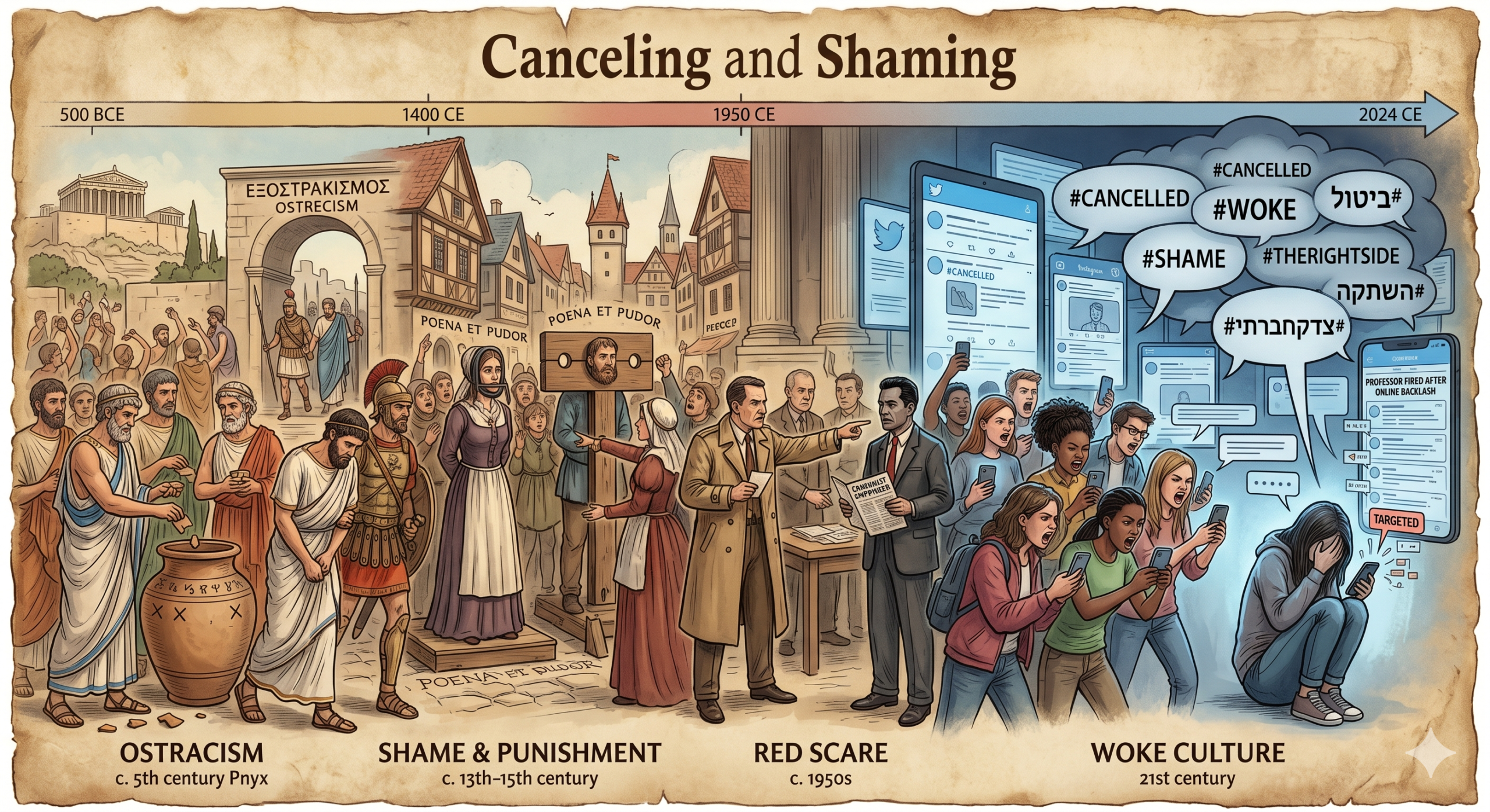 ![[בתמונה: התפתחות תופעת ההשתקה והביטול: מן החרם החברתי הקדום ועד תרבות הווק. התמונה עובדה במערכת הבינה המלאכותית Gemini' של גוגל]](https://www.xn--7dbl2a.com/wp-content/uploads/2026/04/ההיסטוריה-של-הביטול-1-1024x559.png)