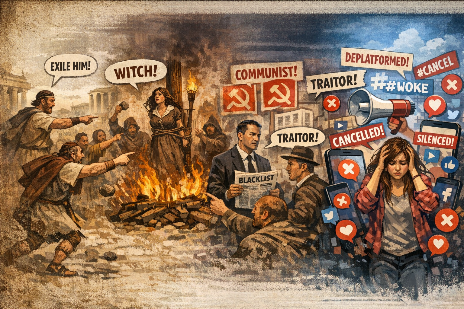 השינוי המרכזי לאורך השנים הוא באמצעים, ובמערב ממוסדות דתיים ופוליטיים, לרשתות חברתיות ותאגידים. כלומר, תופעת הביטול וההשתקה של ימינו, אינה מדובר בתופעה חדשה, אלא הסתגלות טכנולוגית של מנגנון עתיק.