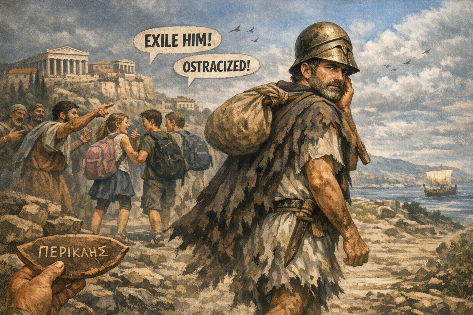 ![[התמונה מציגה את פריקלס ברגע הדרמטי שבו הוא מגורש מאתונה בעקבות האוסטרקיזם. ניתן לראות אותו צועד הרחק מהעיר, מביט לאחור בעצב ובכבוד, בעוד אזרחים אתונאים מצביעים עליו ומחזיקים שברי חרס עם שמו. הנוף של האקרופוליס ברקע והאור הדרמטי מדגישים את עוצמת הסצנה ואת תחושת הבידוד של המנהיג שנפל קורבן להחלטת הציבור. התמונה עובדה במערכת הבינה המלאכותית של Copilot ב- Windowes]](https://www.xn--7dbl2a.com/wp-content/uploads/2026/04/פריקלס-עוזב-את-אתונה-1024x683.png)